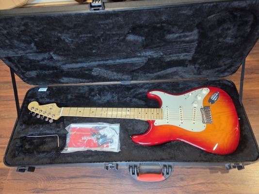 Guitare électrique FENDER modèle Américan Deluxe Upgraded de 2014 entièrement d'ogirine (corps swamp ash, manche érable touche érable à radius compensé 9.5"-14", micros N3 noiseless avec S1 switch, tremolo 2 points deluxe, mécaniques à blocage). très bon état, quelques micros coups, frettes usure 5%, peu jouée. 1ère main, acheté au magasin. Livrée avec son étui d'origine, les documents, la tige de vibrato. Tarif 1650€ ttc