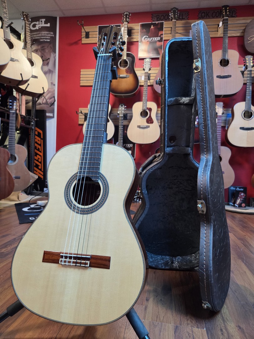Guitare classique haut de gamme Martinez modèle MC128S 100% massive, livrée en étui Martinez Custom Shop. Instrument en excellent état, cordes Labella 2001. Tarif TTC 650 €