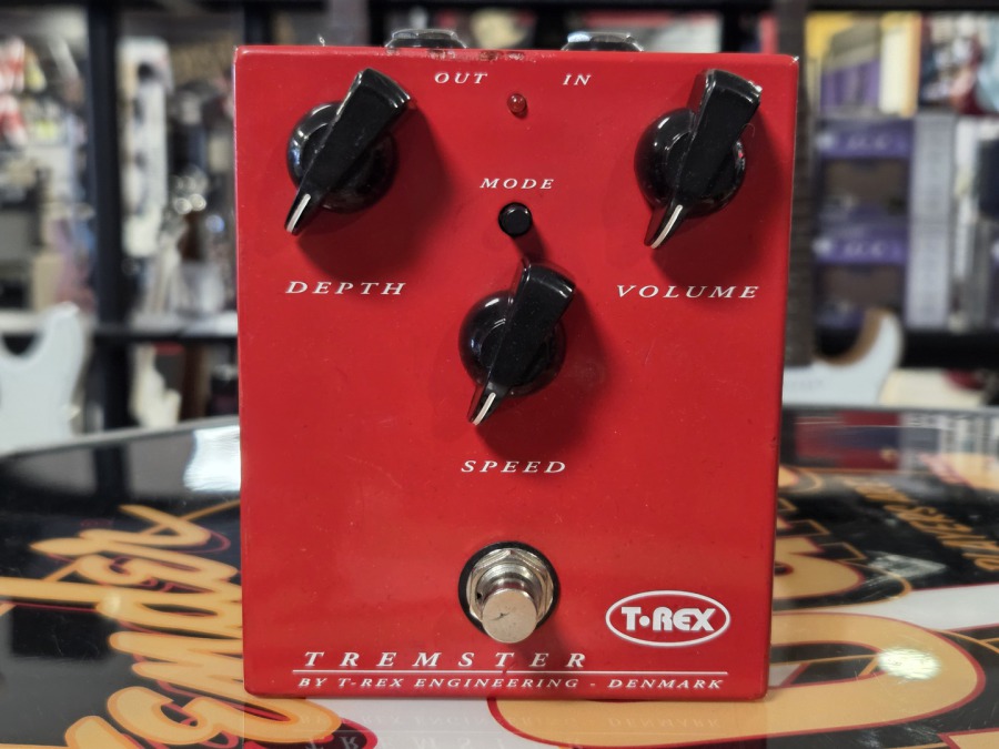 Pédale d'effet T-REX modèle Tremster, pédale de trémolo vintage au caractère doux et chaleureux, 2 modes d'oscillations avec réglage de vitesse et profondeur + volume. Bon état. Tarif 75 € ttc.